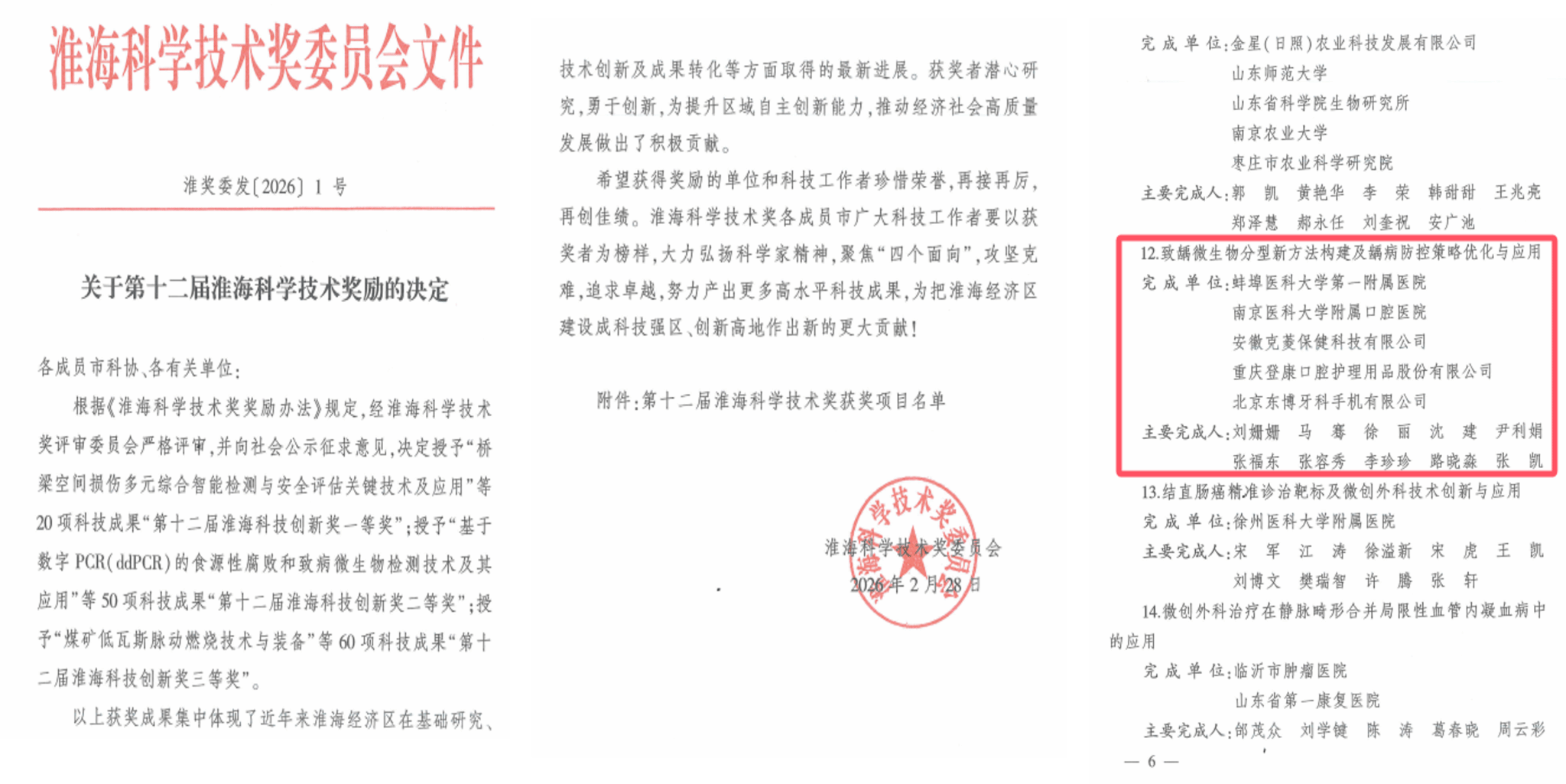 由我校一附院口腔科张凯团队牵头,联合安徽克菱保健科技有限公司等多家单位共同完成的项目《致龋微生物分型新方法构建及龋病防控策略优化与应用》凭借突出的原创性、实用性与转化价值,荣获淮海科技创新奖一等奖。这是我校在口腔医学领域产学研深度融合、服务地方健康产业发展取得的又一重大突破。